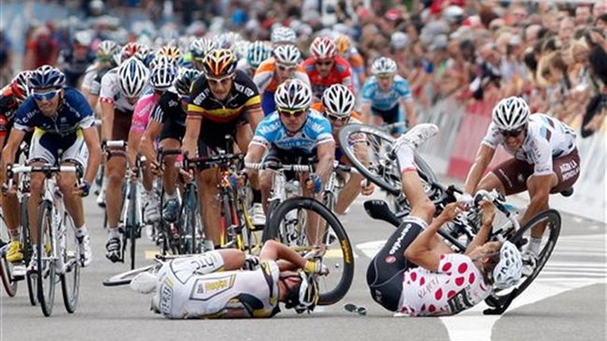 Varias choques estropearon el domingo la primera etapa del Tour de Francia, con el ganador del Giro d"Italia Ivan Basso y el británico David Millar cayéndose de sus bicicletas luego que un perro corriese frente al pelotón. Millar y Basso, que regresa al Tour pro primera vez en cuatro años tras cumplir una suspensión por dopaje, se volvieron a montar en sus bicicletas tras el accidente, que ocurrió unos 56 kilómetros después de la arrancada. Ellos consiguieron reintegrarse al pelotón principal con ayuda de sus compañeros de equipo. El suizo Fabian Cancellara lucía la camiseta de líder luego de ganar el prólogo el sábado. La etapa del domingo se extiende a lo largo de 223,5 kilómetros a través de tierras bajas holandesas y belgas, desde Rotterdan hasta Bruselas. El estadounidense Lance Armstrong, siete veces campeón del Tour, es cuarto en la tabla y es el mejor colocado entre los favoritos a llevarse el título. Cancellara ganó el prólogo, con una ventaja de 22 segundos sobre Armstrong, y 27 sobre Alberto Contador — ganador en el 2009 y favorito este año. El portugués Manuel Cardoso y el suizo Mathias Frank no arrancaron el domingo luego de sufrir heridas en caídas el sábado. El australiano Adam Hansen estuvo involucrado también en un choque cerca de la marca de los 40 kilómetros y se lesiono el cuello.