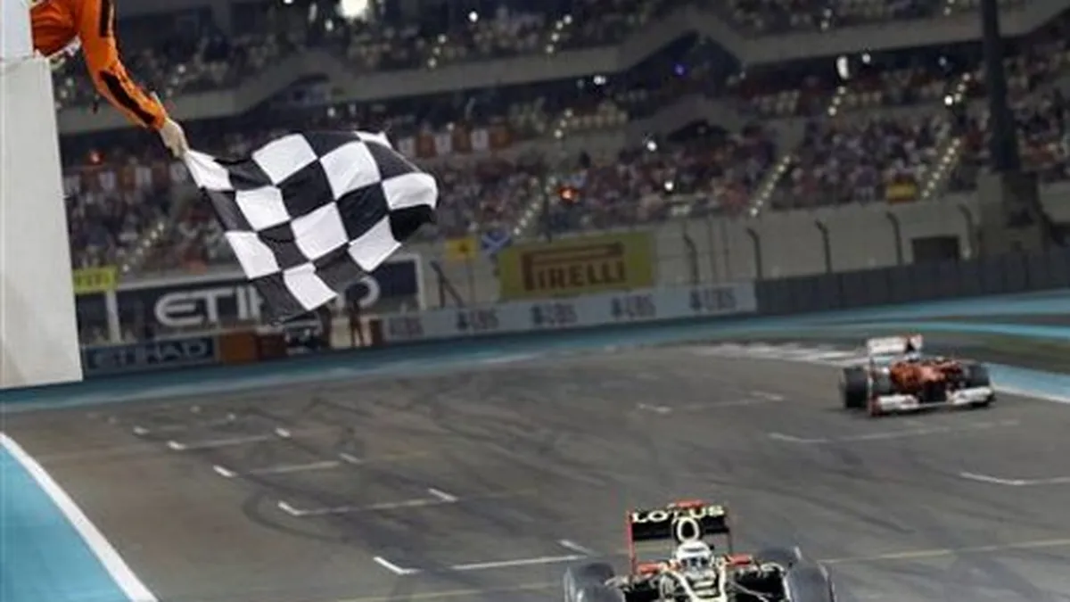 Kimi Raikkonen, al volante de su Lotus, conquistó el domingo el Gran Premio de Abu Dhabi para conseguir su primera victoria desde su regreso a la Fórmula Uno y de paso abrir un interrogante en la lucha por el título cuando faltan dos carreras. El finlandés, campeón en el 2007, superó tras la largada al australiano Mark Webber, de Red Bull, para avanzar al segundo puesto. Y en la vigésima vuelta pasó al frente cuando Lewis Hamilton se retiró debido a un problema eléctrico en su McLaren. Raikkonen superó el embate del español Fernando Alonso, que llegó segundo. El dos veces campeón mundial Sebastian Vettel fue escalando posiciones desde el último puesto para terminar tercero. El alemán Vettel fue penalizado por irregularidades de combustible después de la clasificación y fue obligado a partir desde atrás. De todos modos, Vettel sigue encabezando el campeonato mundial de pilotos con 255 puntos, pero ahora Alonso se le acercó con sus 245 puntos, seguidos ambos por Raikkonen con 198. "Estoy muy feliz por el equipo y por mí pero principalmente por el equipo", dijo Raikkonen, que no ganaba desde el 2009 en el Gran Premio de Bélgica con Ferrari. "Ha sido una temporada dura para el equipo. Ojalá esto nos dé más ánimo". Alonso, que la pasó mal durante las prácticas, dijo estar más que satisfecho con su segundo puesto. "Me siento muy feliz. No fuimos muy competitivos este fin de semana y empezamos sextos con la penalidad de Sebastian", comentó Alonso. "Tuvimos que luchar desde la primera vuelta. Después desplegamos muy buena estrategia que nos permitió pelear hasta el fin. En el último par de vuelta Kimi fue un poquito lento y atacamos. El segundo puesto era lo que más podíamos aspirar. Pero seguiremos luchando hasta el final". Vettel dijo estar convencido de que subiría al podio. "Me dije "vamos por todo o nada""", afirmó. "Eso es lo que hicimos. Tuvimos una carrera fantástica. Fue una linda lucha con Jenson (Button). Era difícil pasarlo. Pero pude hacerlo. Fue emocionante todo el tiempo". El venezolano Pastor Maldonado (Williams) quedó quinto, en tanto que el mexicano Sergio Pérez (Sauber) figuró 15to). En la carrera hubo por lo menos media docena de coques, la más dramática cuando Nico Rosberg embistió el HRT de Narain Karhikeyan, pasó por encima del auto y chocó con una pared. Vettel, que partió de atrás, estuvo en medio de muchas de los incidentes. Rozó el Williams de Bruno Senna y debió parar en los puestos para remplazar el alerón delantero. Después pasó a Romain Grosjean y chocó con Felipe Massa, haciendo que girara la Ferrari del brasileño. Pese a todo, avanzó al cuarto puesto y después superó a Button faltando tres vueltas. El abandono de Hamilton pone fin a sus aspiraciones de ganar un segundo título como también del compañero de Vettel, Mark Webber, quien se detuvo en los puestos para permitir que el alemán lo pasara. La carrera del australiano concluyó en el giro 39 cuando chocó con Grosjean, que se había quedado parado después de chocar con el Sauber del mexicano Sergio Pérez.