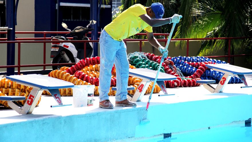 En la piscina Eileen Coparropa, donde se desarrollará las competencias de natación se efectuaron labores de pintura en los baños, barandas, gradas, pasillos, al igual que cambio de lámparas en los baños y reparaciones en el techo de las gradas.