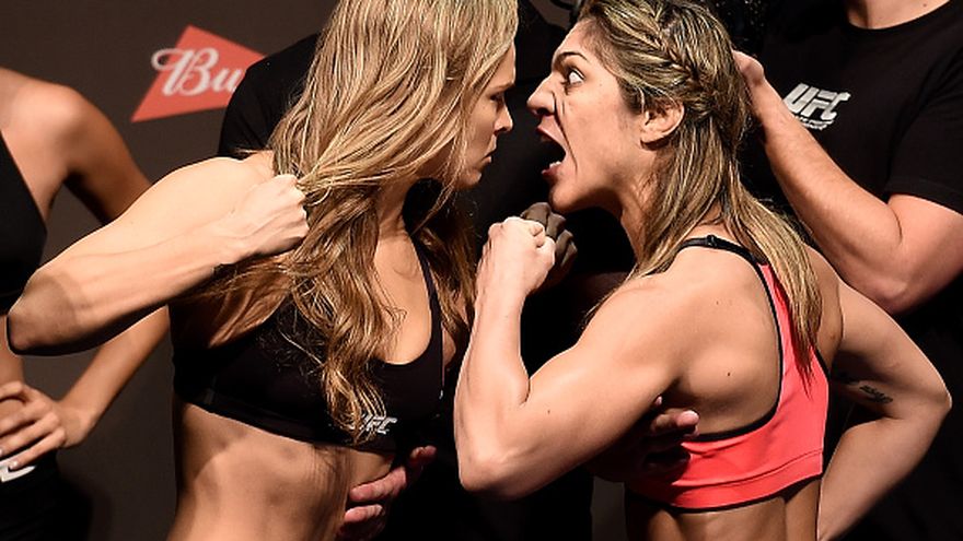 La monarca no se quedó atrás ante los desafíos de Correia en la Arena HSBC donde fue el pesaje y será la pelea, y la enfrentó con bravura, ya que entre estas dos gladiadoras existen cuentas pendientes, luego de que Bethe ha hablado de la familia de Rousey.