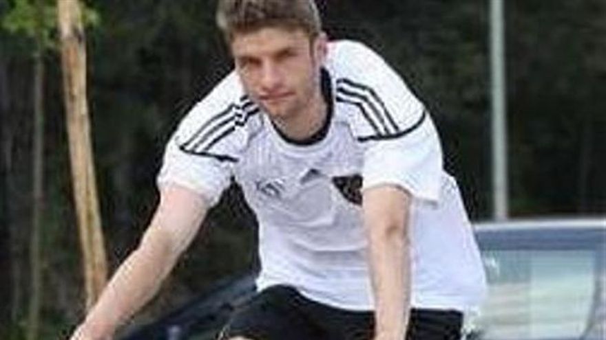El delantero de Alemania Thomas Mueller sufrió cortes en el rostro y se lastimó una rodilla al caerse el miércoles de una bicicleta de montaña durante una sesión de entrenamiento con miras a la Copa Mundial. El atacante del Bayern Munich, de 20 años, se había incorporado al equipo el martes, tras jugar la final de la Liga de Campeones el sábado ante el Inter. La federación alemana informó que Mueller necesitó puntos en la mandíbula, pero que no sufrió lesiones óseas ni musculares serias que comprometan su presencia en el Mundial de Sudáfrica. Alemania ha sufrido una serie de lesiones, la peor de las cuales fue la que dejó afuera del Mundial a su capitán Michael Ballack.