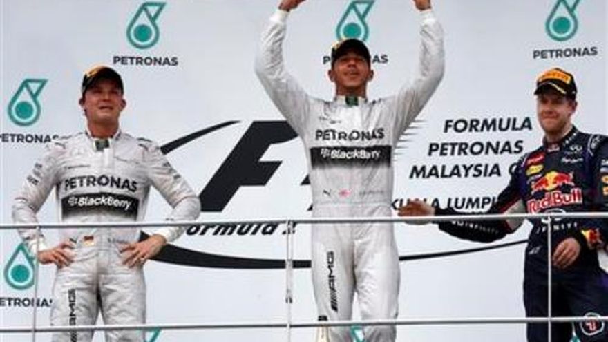 SEPANG, Malasia (AP) -- El británico Lewis Hamilton puso fin a su sequía en el Gran Premio de Fórmula Uno en Malasia y conquistó el domingo la prueba en la que su equipo Mercedes logró el 1-2 en la competición. Hamilton superó a su compañero, el alemán Nico Rosberg, por 17,3 segundos en la pista del Circuito Internacional de Sepang, en tanto que el campeón defensor, el germano Sebastián Vettel, de Red Bull, terminó en tercer lugar. Hamilton se despegó desde el inicio de la carrera, en la que arrancó primero en la parrilla y lideró toda la prueba. Se repuso de su retiro en la primera carrera de la temporada que se disputó en Australia y por fin, en su octavo intento, logró su primer triunfo en Malasia que se le había negado por mucho tiempo. El español Fernando Alonso, de Ferrari, terminó en cuarto puesto, adelante del alemán Nico Hulkenberg, de Force India, y del británico Jenson Button, de McLaren, en tanto que el brasileño Felipe Massa, de Williams, no cedió el séptimo lugar a su compañero británico Valtteri Bottas como le había pedido el equipo. Dos novatos se llevaron las últimas dos posiciones que reditúan puntos, el danés Kevin Magnussen, de McLaren, que concluyó en noveno lugar, y el ruso Daniil Kvyat, de Toro Rosso, que cerró en décimo. En una jornada en la que estuvo presente la amenaza de aguacero, el australiano Daniel Ricciardo, de Red Bull, y el finlandés Kimi Raikkonen, de Ferrari, tuvieron la peor de las suertes cuando iban en un buen lugar en la competición. Ricciardo iba cuarto cuando faltaban 15 vueltas, pero sus técnicos no le colocaron correctamente un neumático en una escala de servicio, se vio obligado a detenerse a media salida y tuvo que ser empujado de regreso para que le arreglaran el problema. Poco después, el australiano perdió su ala frontal, fue sancionado con una demora de 10 segundos en el área de servicio por una salida insegura y se retiró de la prueba. En la primera vuelta, Magnussen golpeó por detrás a Raikkonen, a quien se le pinchó un neumático y se rezagó último entre los competidores. Raikkonen terminó en duodécimo sitio, detrás del suizo Romain Gorsjean, que sorprendió y concluyó la carrera en un Lotus que no era nada confiable.