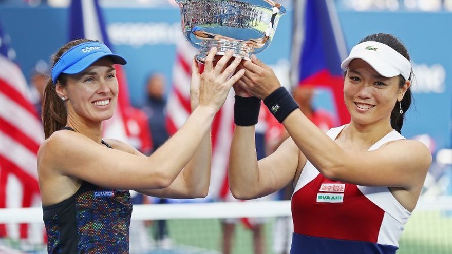 La suiza Martina Hingis y la taiwanesa Chan Yung-Jan conquistaron este domingo el título de dobles femenino del Abierto de Estados Unidos de tenis al derrotar en dos sets corridos de 6-3, 6-2 a la dupla checa de Lucie Hradecka y Katerina Siniakova.