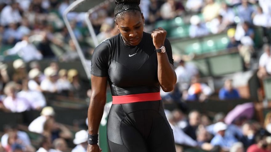 Serena Williams regresaba a Roland Garros este martes con un llamativo atuendo, un mono ceñido negro con un cinturón rosa, con una estética a medio camino entre Catwoman y una princesa guerrera de Black Panther.
