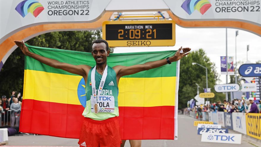 Etiopía triunfó el domingo en el maratón masculino del Mundial de atletismo de Eugene, en Estados Unidos, con la victoria de Tamirat Tola y la segunda plaza de su compatriota Mosinet Geremew.