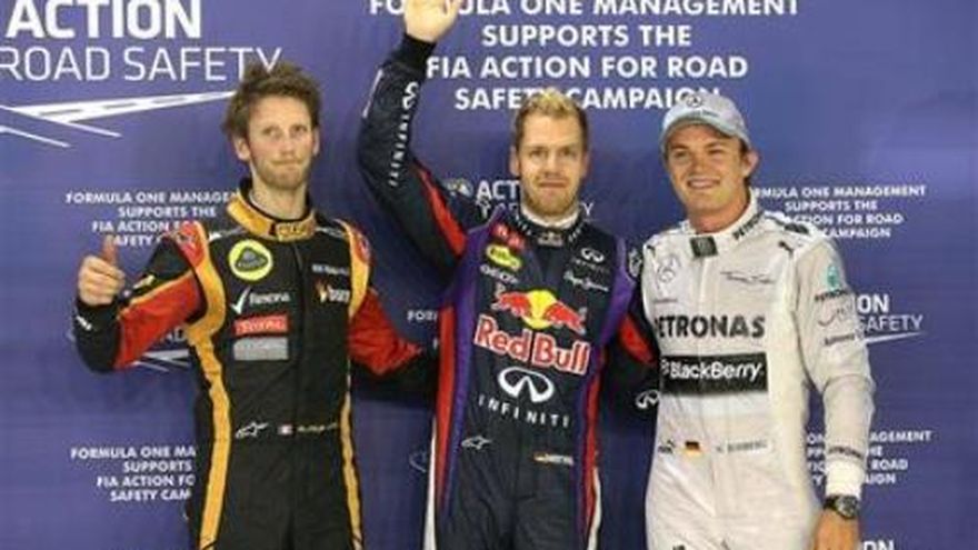 Sebastian Vettel consiguió el sábado la pole del Gran Premio de Singapur de la Fórmula Uno, para colocarse en una posición inmejorable para aumentar su amplia ventaja en el campeonato mundial de pilotos. El piloto de Red Bull busca su tercer triunfo consecutivo en la carrera nocturna del circuito de Marina Bay. Vettel logró tanta ventaja que ni siquiera se molestó en realizar la última vuelta rápida de la sesión. La apuesta de no dar la última vuelta parecía riesgosa, sobre todo cuando Nico Rosberg (Mercedes), Mark Webber (Red Bull) y Romain Grosjean (Lotus) comenzaron sus últimas vueltas a toda velocidad y amenazaron con desplazar a Vettel del puesto de honor. Vettel se comía las uñas mientras observa los monitores en el garaje, y festejó cuando vio que su tiempo se mantuvo como el mejor. Rosberg lo acompañará en la primera fila de la parrilla, a una décima de segundo. Grosjean y Webber ocupan la segunda fila, mientras que Lewis Hamilton (Mercedes) largará quinto. Todos se clasificaron a menos de medio segundo de Vettel, quien consiguió su quinta pole de la temporada. "Sabía que tenía una ventaja, y por eso decidimos no salir", comentó Vettel. "Lo que no sabes es cuánto mejora la pista. Fue muy cerrado, y no es la mejor sensación cuando sólo puedes mirar". "Estoy muy contento con el resultado, el vehículo ha estado fenomenal todo el fin de semana". Rosberg calificó el segundo puesto como un "gran resultado", pero dijo que la diferencia entre su tiempo y el de Vettel es algo engañosa. "Ellos (Red Bull) apostaron un poco y estoy seguro son un poco más rápidos que la última vez, si Sebastian usa otras llantas", señaló el alemán. El tercer lugar de Grosjean iguala su mejor desempeño en una clasificación esta temporada. Su compañero Kimi Raikkonen arrancará 13ro. Tras el anuncio de que Raikkonen se irá a Ferrari el próximo año, Grosjean busca ser el líder de Lotus en 2014, aunque también sabe que no tiene su asiento garantizado. "En realidad no me importa (superar a Raikkonen)", afirmó Grosjean. "Mi relación con Kimi nunca ha sido de hablar mucho. Sólo estoy concentrado en lo que tengo que hacer, y ya veremos". Los pilotos de Ferrari, Felipe Massa y Fernando Alonso, se clasificaron sexto y séptimo, respectivamente, mientras que Jenson Button (McLaren) fue octavo, Daniel Ricciardo (Toro Rosso) noveno y el mexicano Esteban Gutiérrez (Sauber) logró el mejor resultado de su carrera con un décimo puesto en la parrilla. Vettel, que tiene 53 puntos de ventaja en el campeonato mundial cuando restan siete carreras, busca su tercera victoria consecutiva en el circuito nocturno de Marina Bay. "Es complicado rebasar en esta pista, porque es una carrera muy larga, con bastantes oportunidades para todos, y usualmente tenemos un vehículo de seguridad en la carrera", señaló el germano.
