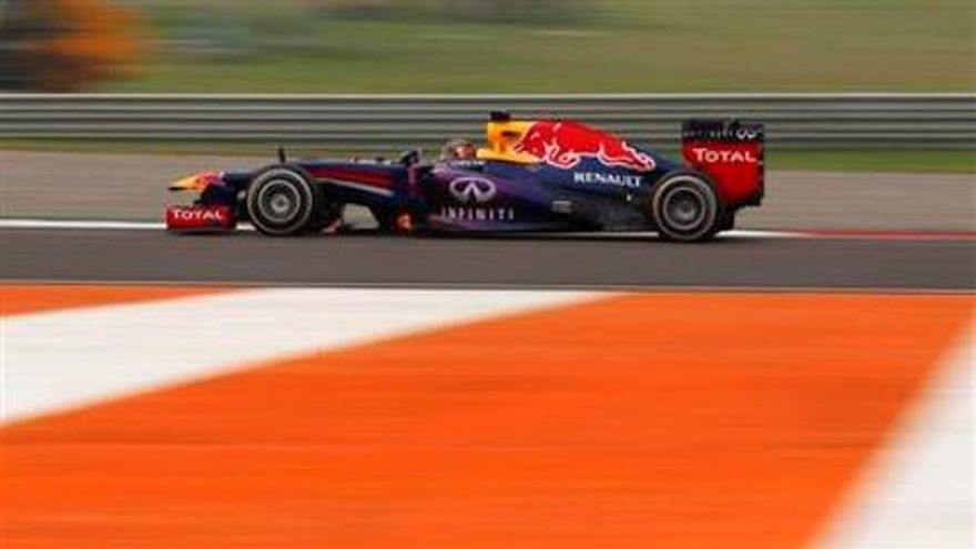 Sebastian Vettel continuó su dominio en India superando el viernes a su compañero de Red Bull Mark Webber para terminar con el mejor tiempo en las primeras prácticas para el Gran Premio de Fórmula Uno el domingo. Vettel registró un tiempo de 1 minuto, 26,683 segundos para una vuelta en el Circuito Internacional Buddh International Circuit, apenas 0,188 más rápido que Webber. El alemán Vettel, que ha ganado los dos Gran Premios de India previos, puede sellar su cuarto título mundial consecutivo si termina quinto o mejor el domingo. Romain Grosjean, de Lotus, fue el tercero más rápido, con un tiempo de 1:26.220, por delante del británico Lewis Hamilton, de Mercedes, con 1:26.399. "Espero tener otra buena jornada mañana, lo que nos daría una sólida posición en las clasificaciones, si la evidencia de hoy es algo a considerar", dijo Grosjean. "Vamos a hacer todo lo posible para darle pelea a Red Bull". El piloto Ferrari Fernando Alonso superó problemas con la caja de velocidades en la sesión matutina para terminar con el quinto mejor tiempo, por encima de Nico Rosberg, de Mercedes, y del brasileño Felipe Massa, también de Ferrari.