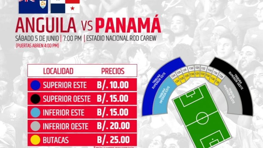 La Federación Panameña de Fútbol informa que los boletos para el partido entre Anguila y Panamá, a disputarse el 5 de junio a las 7pm en el Estadio Nacional Rod Carew, ya se encuentran a la venta.