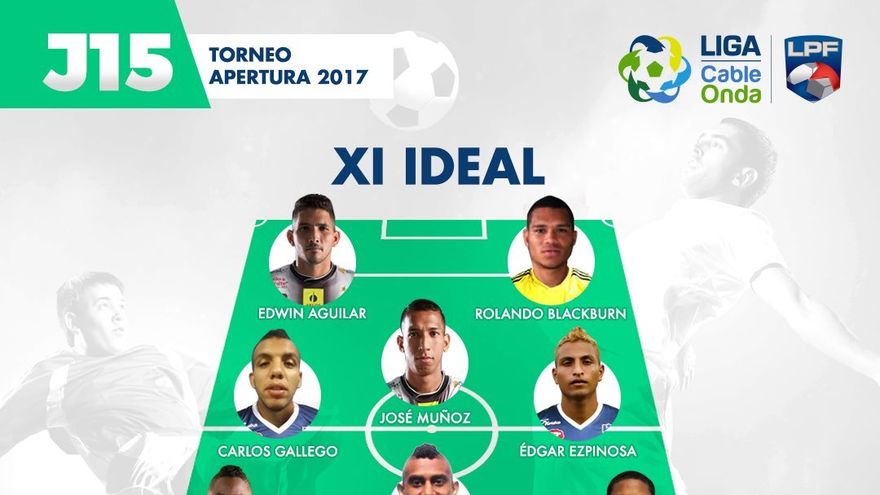 Miguel Lloyd; Humberto Mendoza, Rolando Algandona, Daniel Ortíz, Félix Góndola; Josiel Nuñez, Carlos Gallego, José Muñoz, Édgar Ezpinosa; Edwin Aguilar y Rolando Blackburn forman el once ideal de la decimoquinta jornada del Torneo Apertura 2017 de la Liga Panameña de Fútbol (LPF).