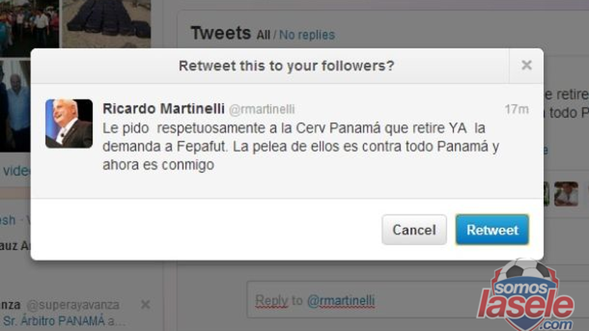 El problema del secuestro por parte de la cervecería del barú en contra de la Federación Panameña de Fútbol ya toco las puertas de la presidencia de la República, el Presidente Ricardo Martinelli colgó en su cuenta de tuiter el siguiente mensaje; “Le pido respetuosamente a la Cerv Panamá que retire YA la demanda a Fepafut. La pelea de ellos es contra todo Panamá y ahora es conmigo”.