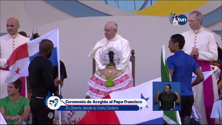 Durante ese momento, una joven ataviada con la pollera, traje típico panameño, le entregó al Papa una estola con motivos distintivos de Panamá.