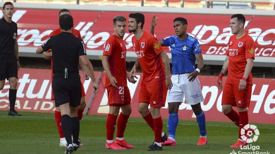 Tras el aviso del VAR, revocó dicha tarjeta y le mostró la roja al futbolista del Real Oviedo por agredir a Iván Calero.